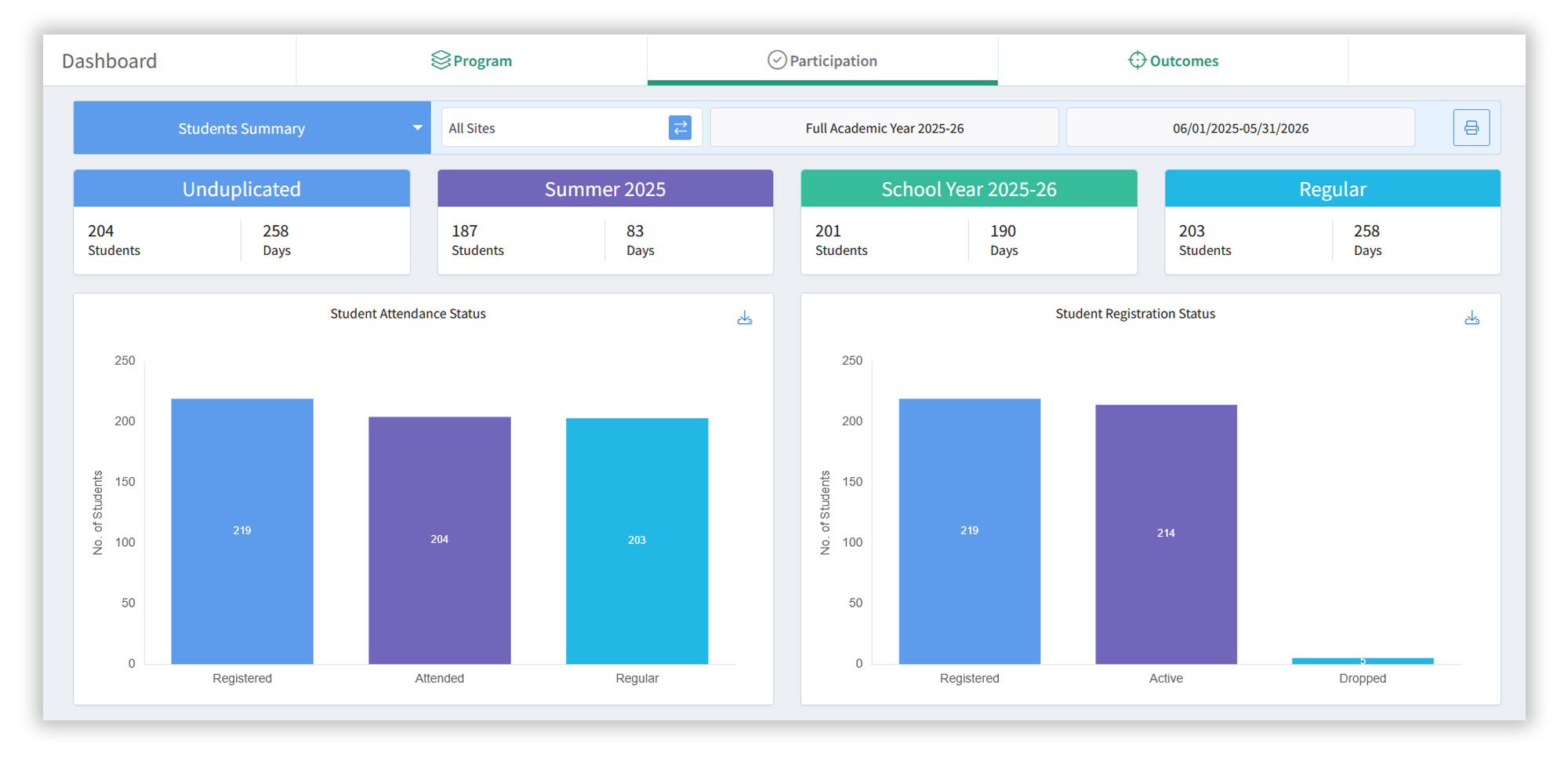 Based on the dashboard analysis, administrators can modify operations to maximize their program's overall impact. For example, if a site is consistently recording low attendance, program administrators can look into the issue and work towards increasing student engagement and attendance. Similarly, if the outcomes tool shows poor student performance, additional resources can be allocated in the required focus areas to improve student learning.