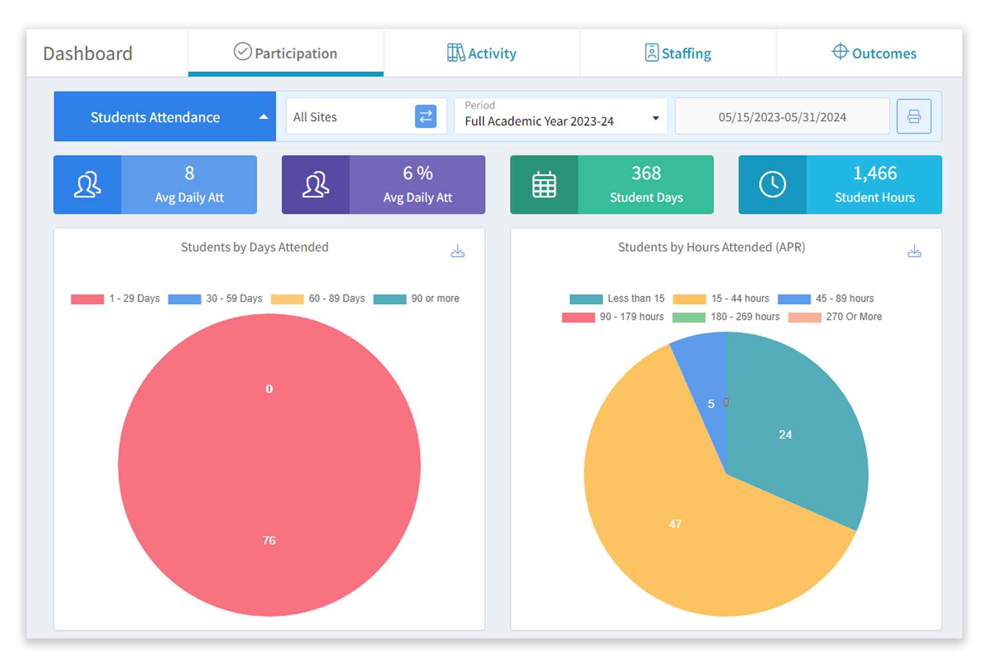 EZReports provides an intuitive dashboard to help administrators monitor essential afterschool program data. It covers different key performance indicators (KPIs) and metrics, such as student attendance, program quality, and academic performance. Administrators can use this data to make informed decisions and improve the overall operations of the afterschool program.
