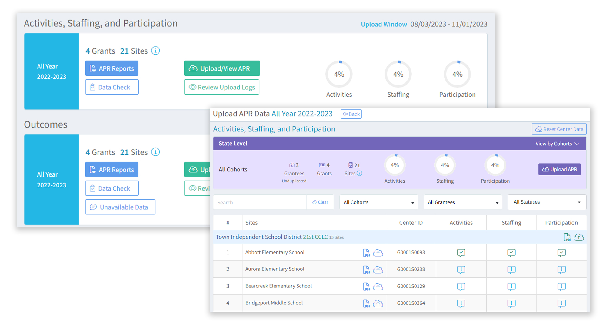 • Upload APR data by term (summer or school year), funding cycles, grant, or site