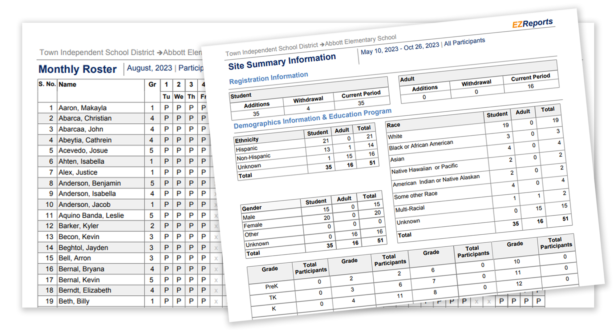 - Over 40 standard reports covering all reporting needs of an afterschool program.